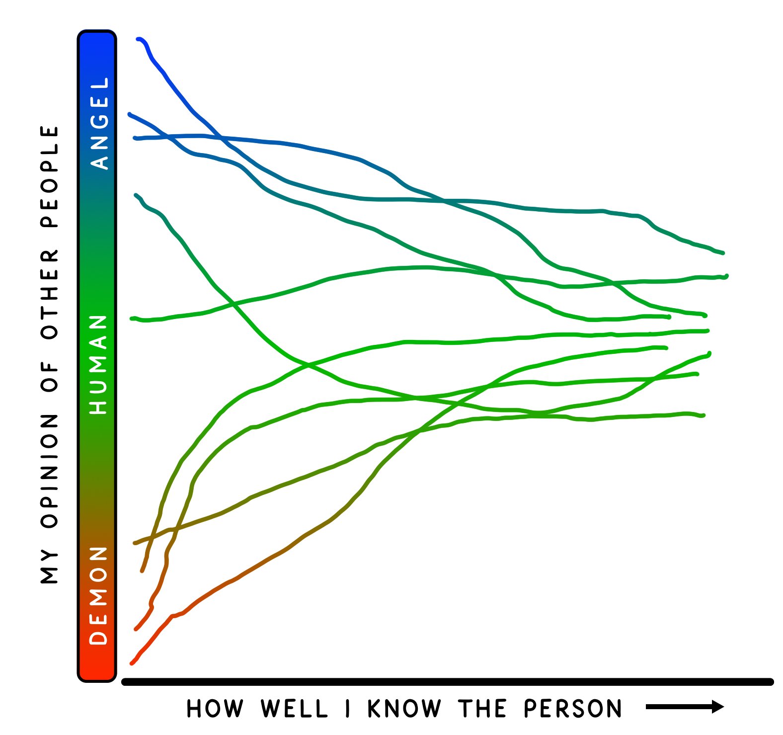 In my experience, getting to know someone I lionize ends up being a disappointment and getting to know someone I demonize is pleasantly surprising. Because humans aren't angels or demons, they're humans.